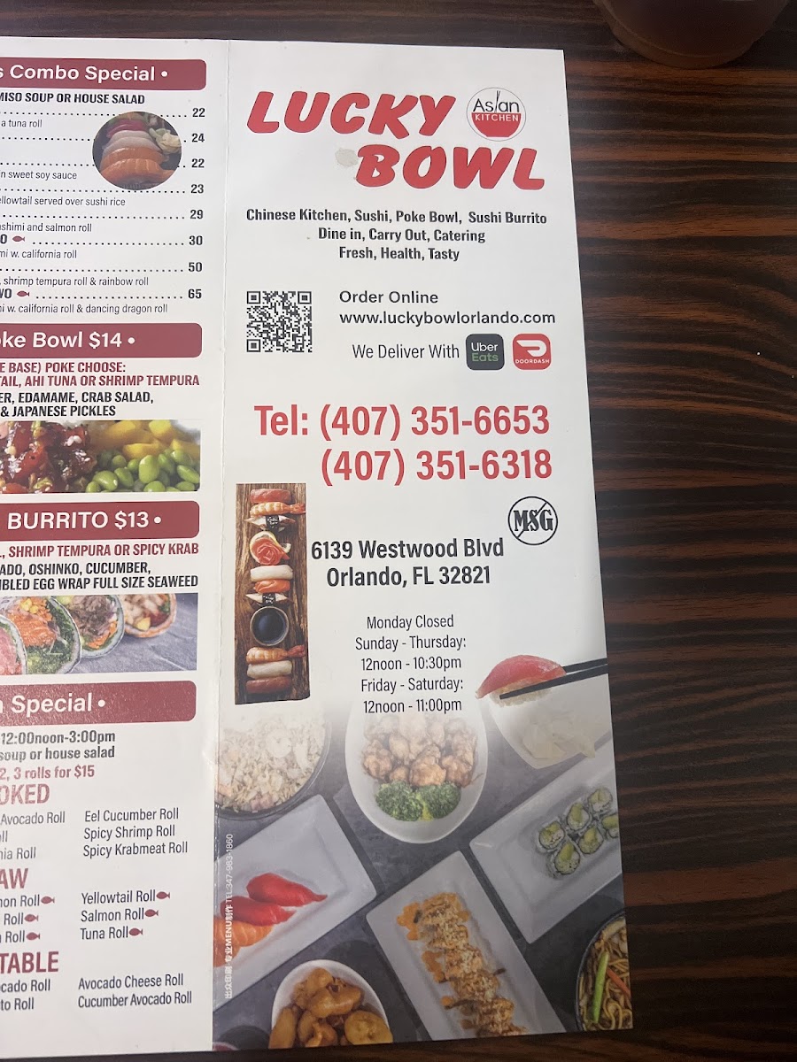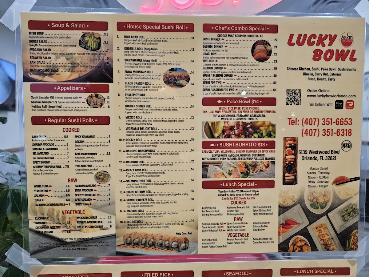 Inside come with spicy crabmeat and cream cheese, topped with slice avocado, tempura white fish and yum-yum sauce and sweet soy sauce